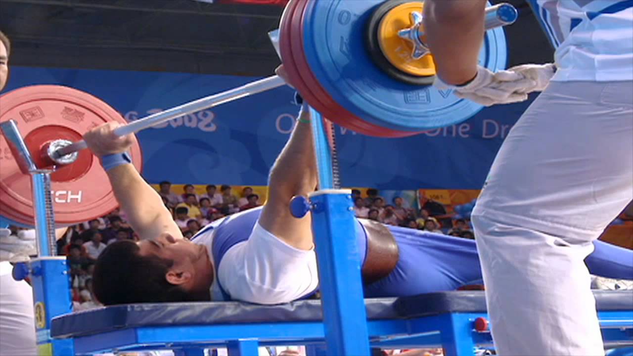 Open to male and female athletes with eight eligible physical impairments athletes compete in one sport class across 10 different weight categories per gender. Anthony Peddle of Great Britain the Sydney gold medallist struggles with a no-lift at 1575kg approximately 422 pounds in the Mens 48kg category in powerlifting on September 20 2004 during the 2004 Paralympic Games in Athens Greece. Para powerlifting day four preview.